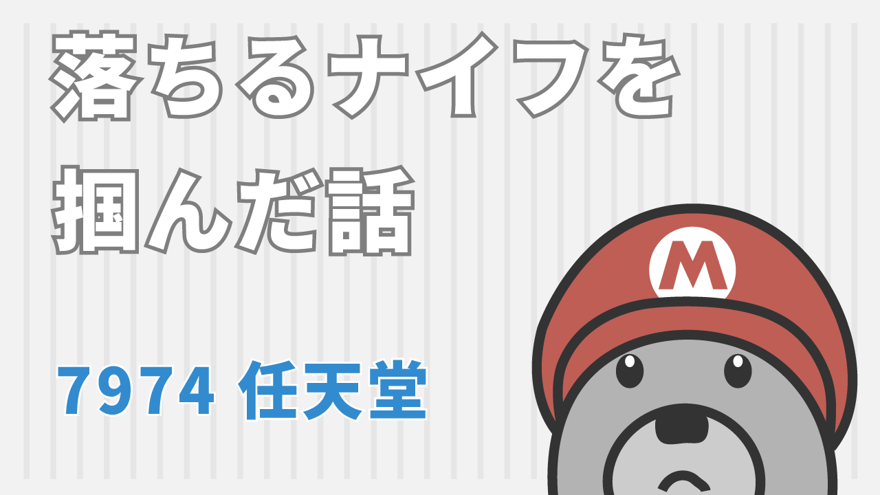 落ちるナイフを掴んだ話 落ちるナイフを掴みました。 「7974 任天堂」です。 任天堂だし、短期間で戻るのではないかと希望的簡素憶で考えていました。 しかし、いまは握ったナイフで掌から含み損というなの真っ赤な血が出ている状態。 甘かった...