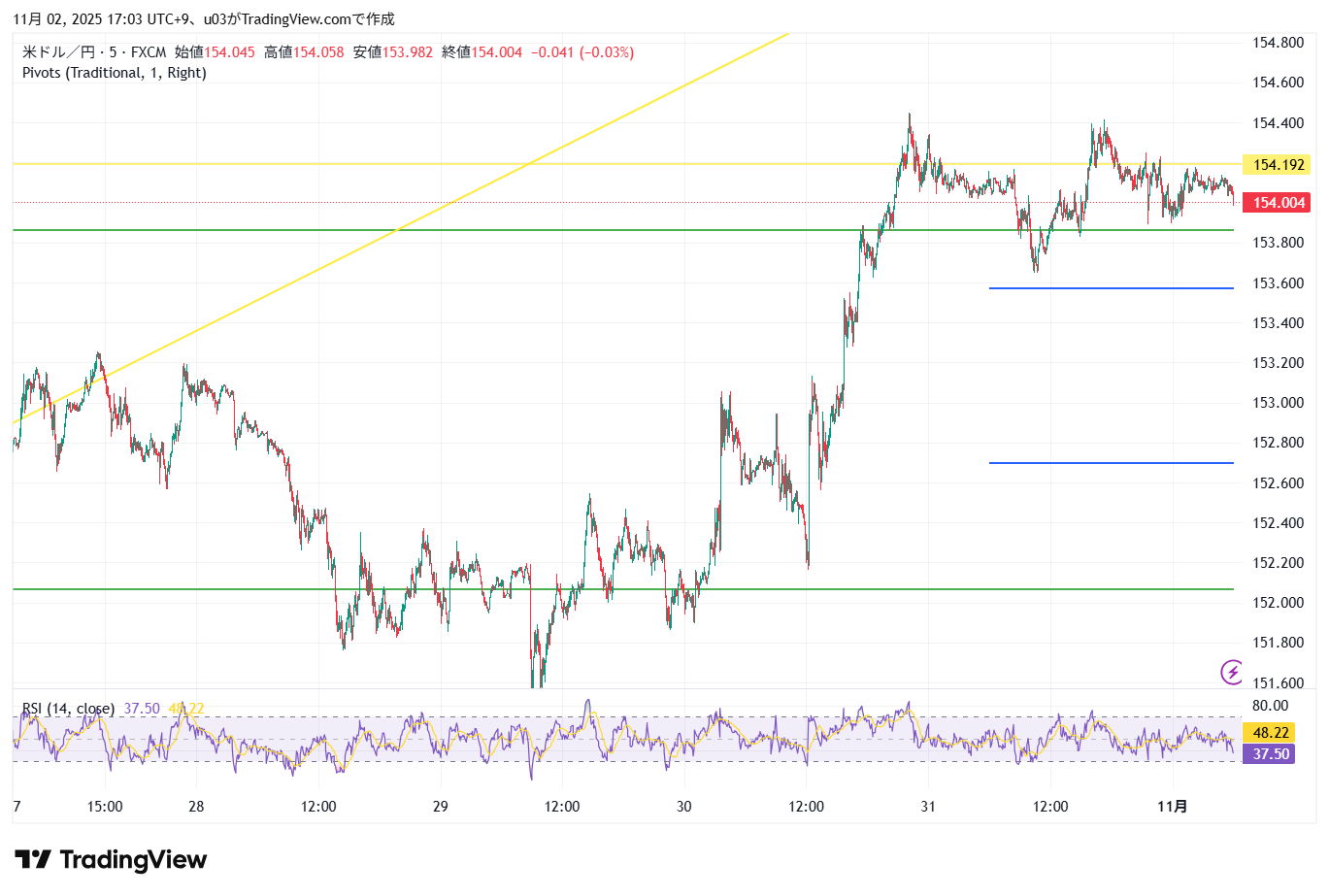 逆に下に抜けた場合は、152円台前半。
