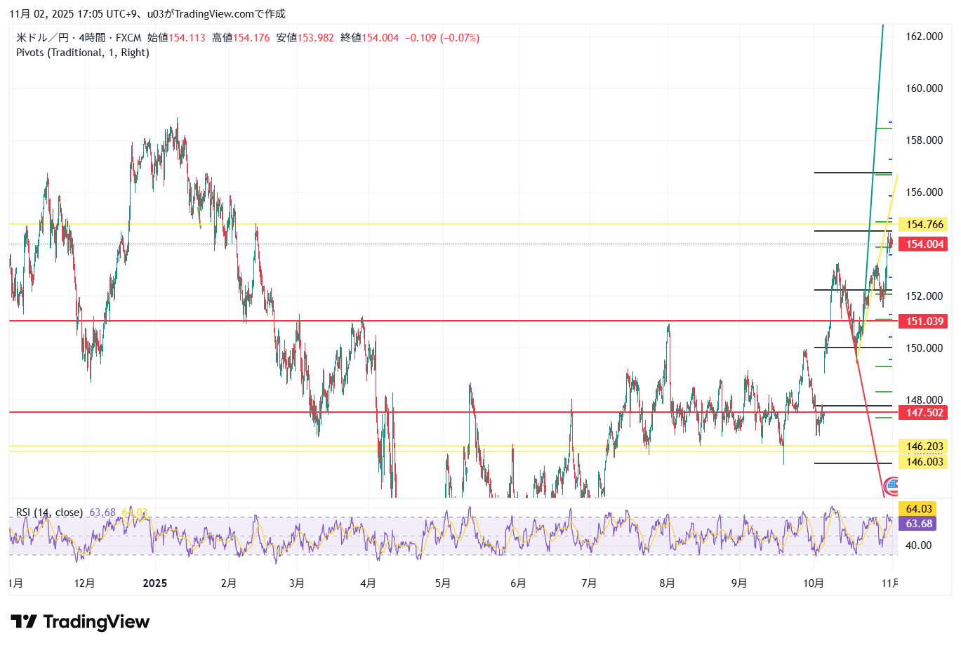 上に抜けた場合、次のターゲットは156円台後半で見ています。