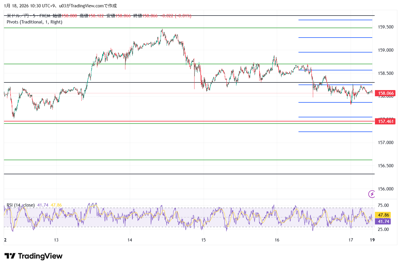 月曜日にほぼ158円から始まったドル円は、157.5円付近まで調整をつけたのちに上昇。